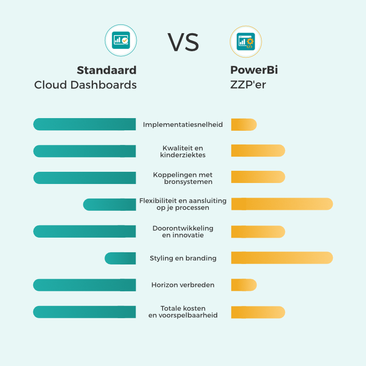 Power BI biedt vrijheid en maatwerk, maar vergt tijd, kennis en constante aandacht. Standaard dashboard zijn iets minder flexibel, maar geven snelheid, betrouwbaarheid en zijn gebouwd met diepgaande branchekennis.